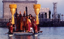 Re-enacting King Kamehameha the Great and his court, either as a procession or overseeing an event. Arrival by foot or where permits, by double hull outrigger canoe.