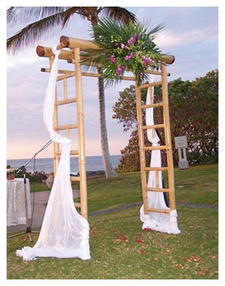 A 6'x8' Bamboo Archway decorated with tropical flowers and tulle.