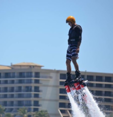 The Flyboard is a water jetpack attached to a jet ski which supplies propulsion to drive the Flyboard through air and water to perform a sport known as flyboarding.